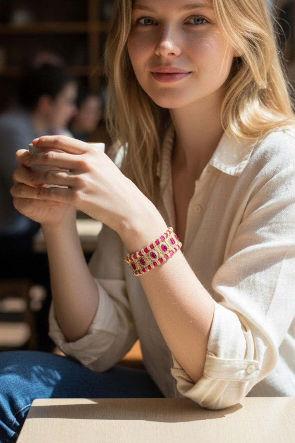 Bracelet noble et précieux minutieusement confectionné à la main, en fil de soie et fil de coton empiècement en plaquée or sertis de véritable zircons et pierres précieuses.m et éclats de diamants de 1er choix.