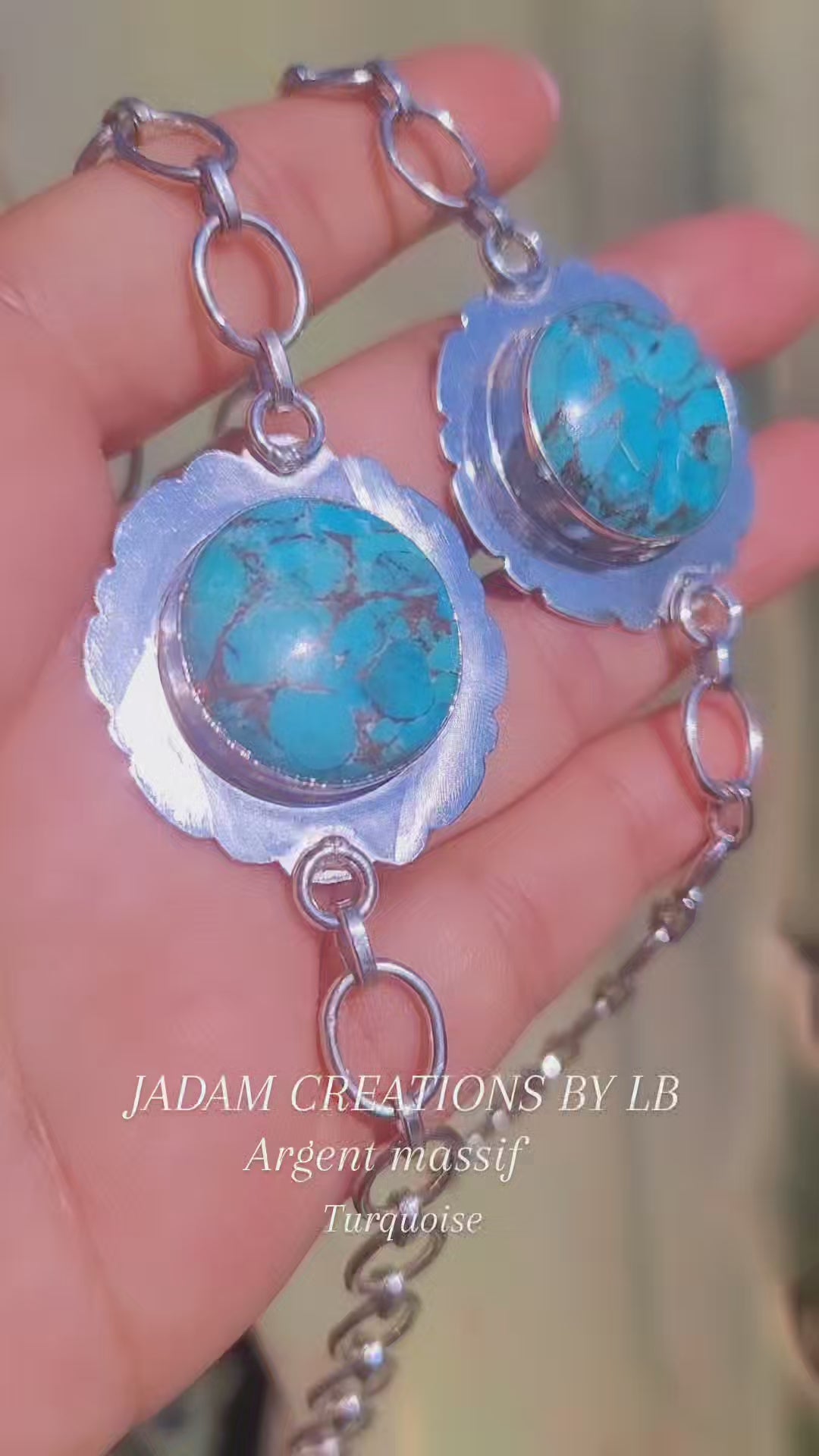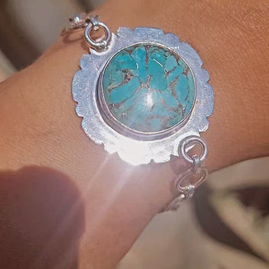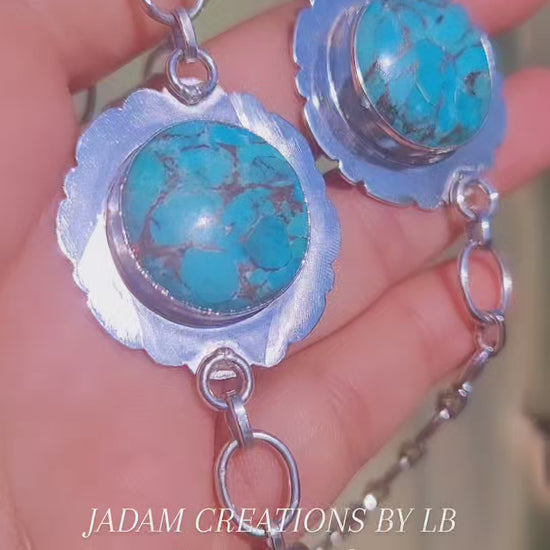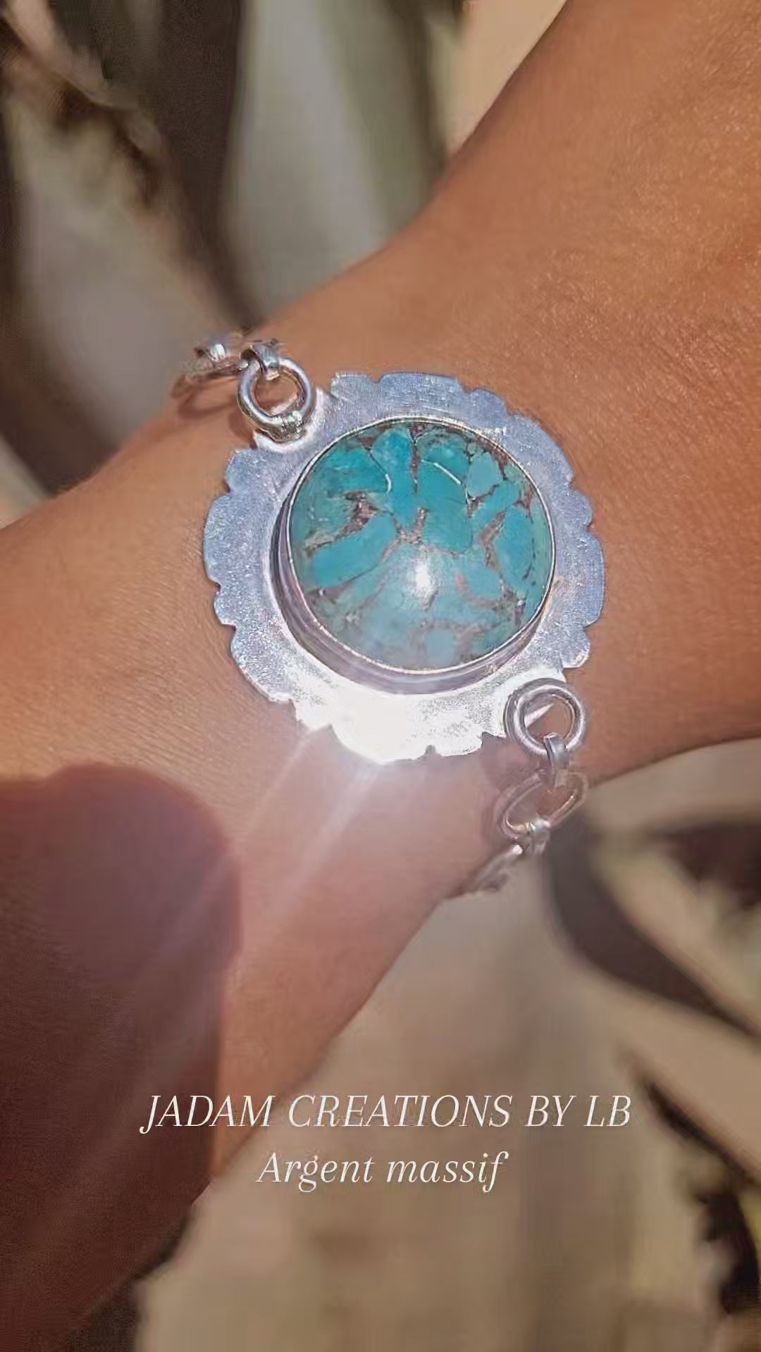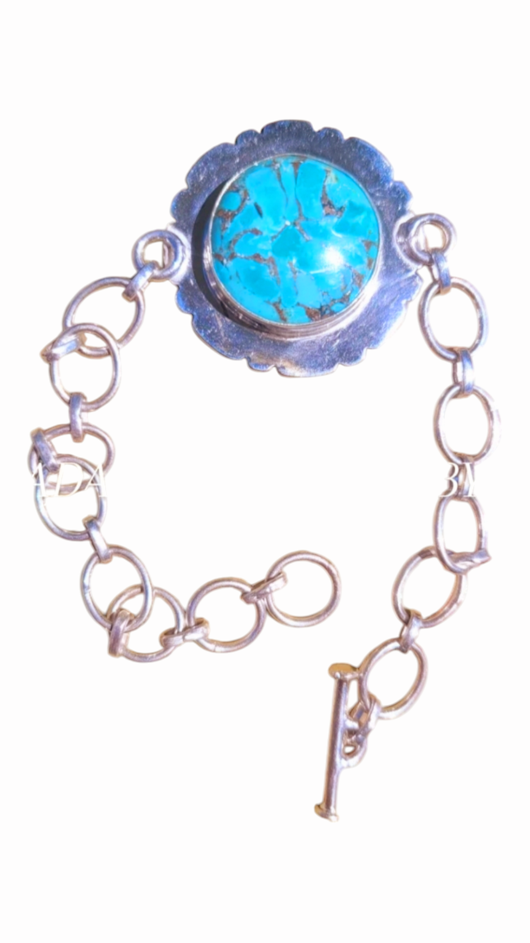 Superbe bracelet en argent massif réglable grâce à ces maillons et fermoir T, grande fleur central turquoise mohave.