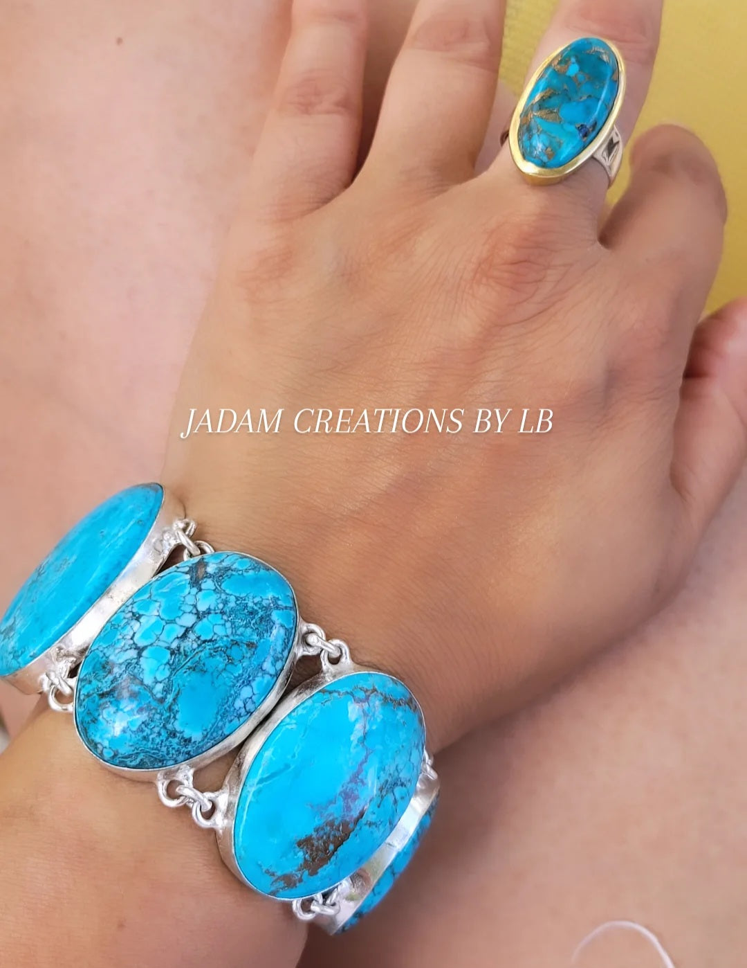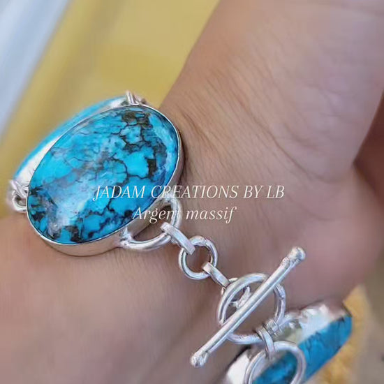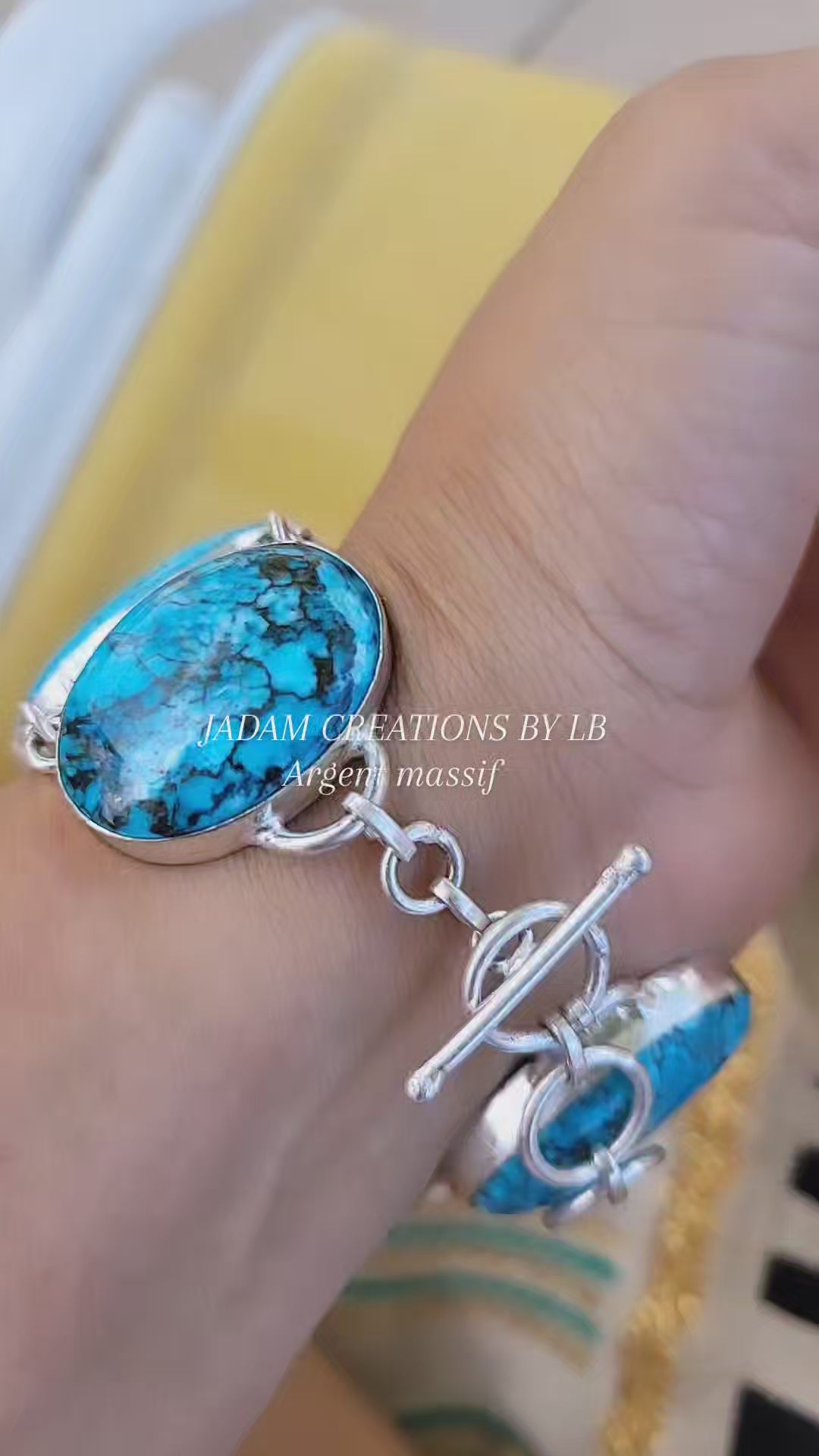 Bracelet argent massif entièrement façonnés à la main serti de grosse turquoise mohave lumineuse.