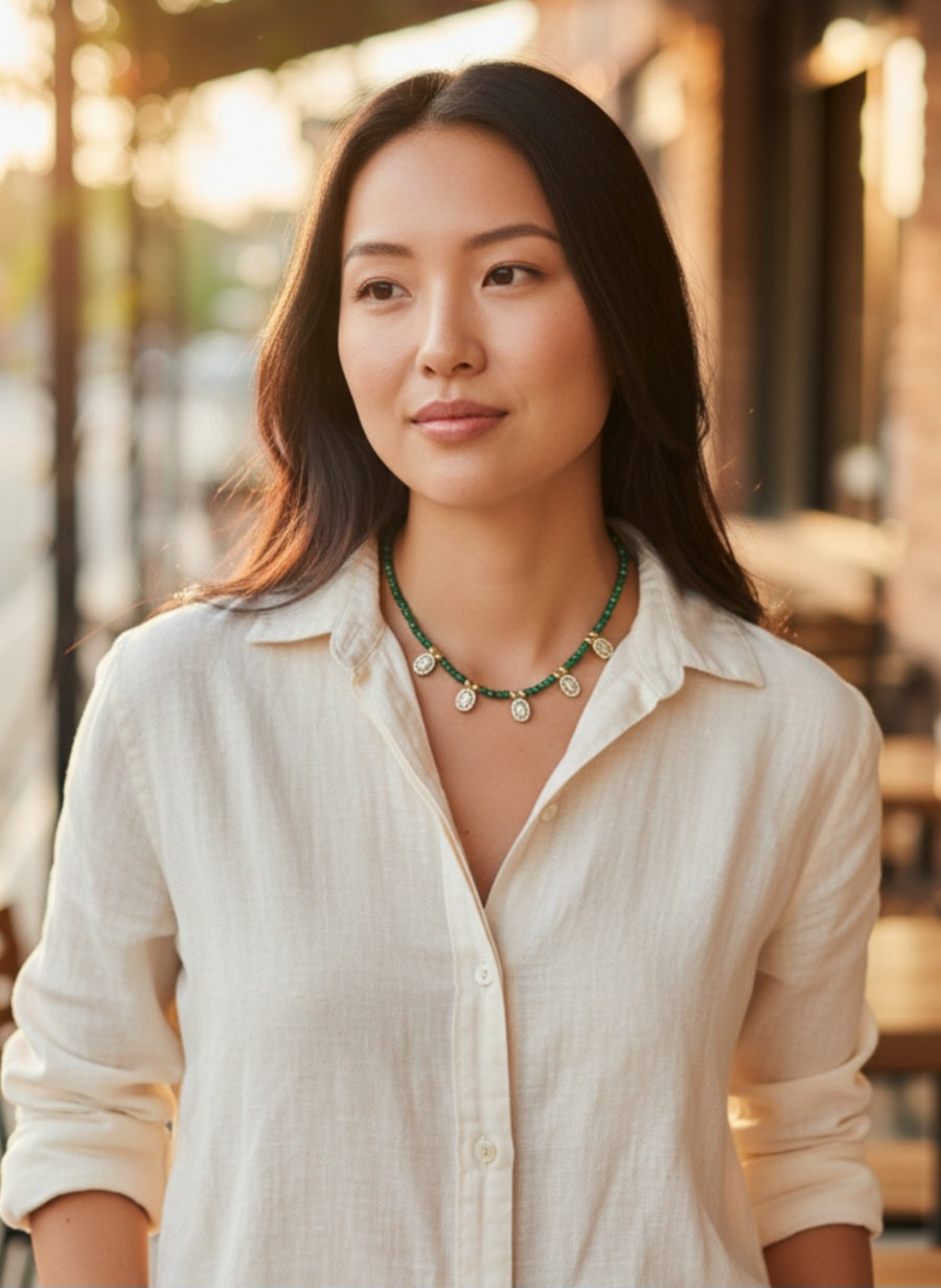 Collier de environ 50 cm et 5 cm d'extensions suplementaire en onyx verte avec élément plaquée or incrusté de véritable cristaux.
