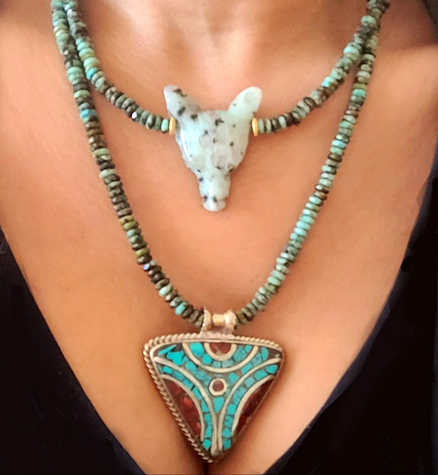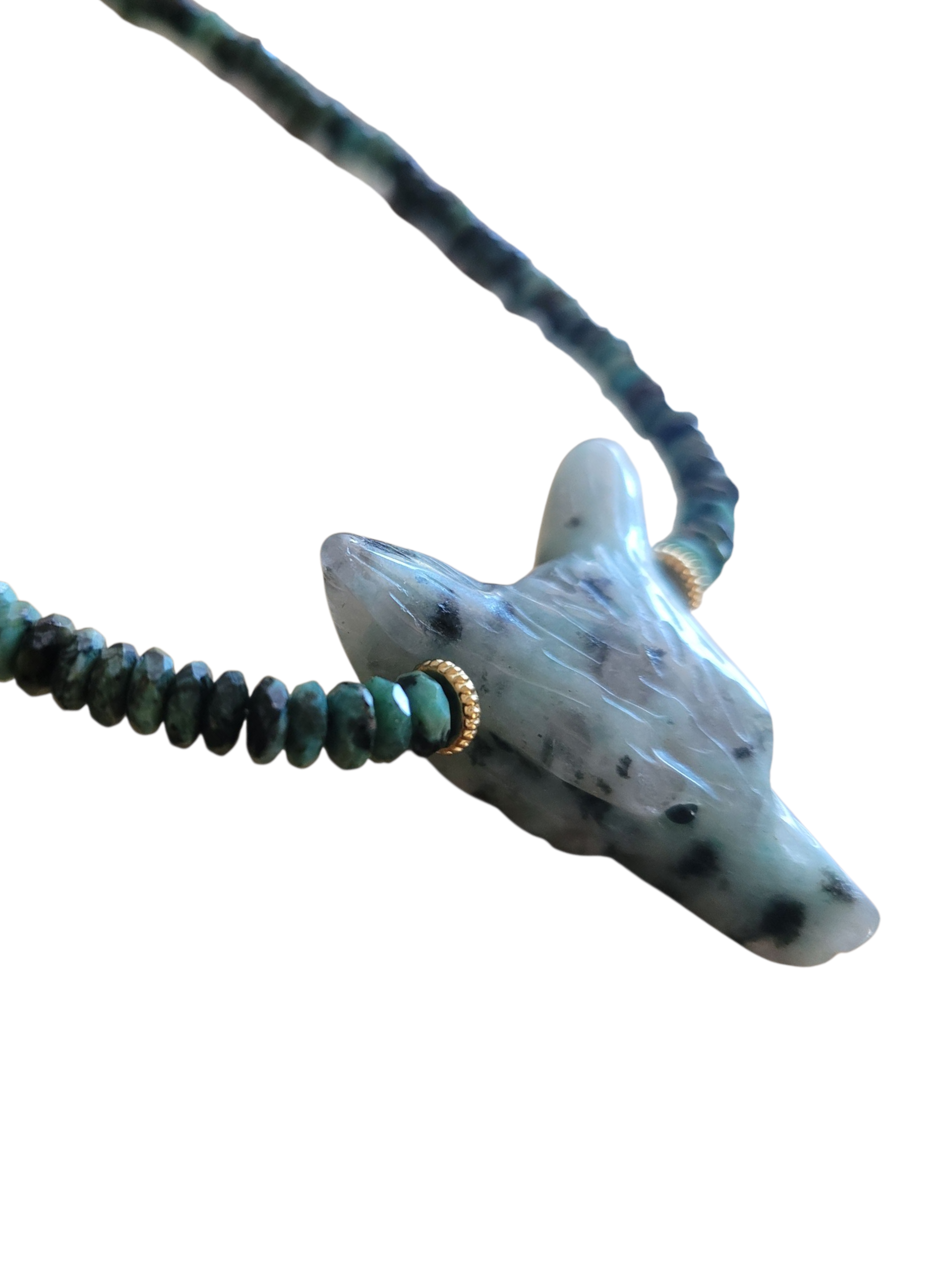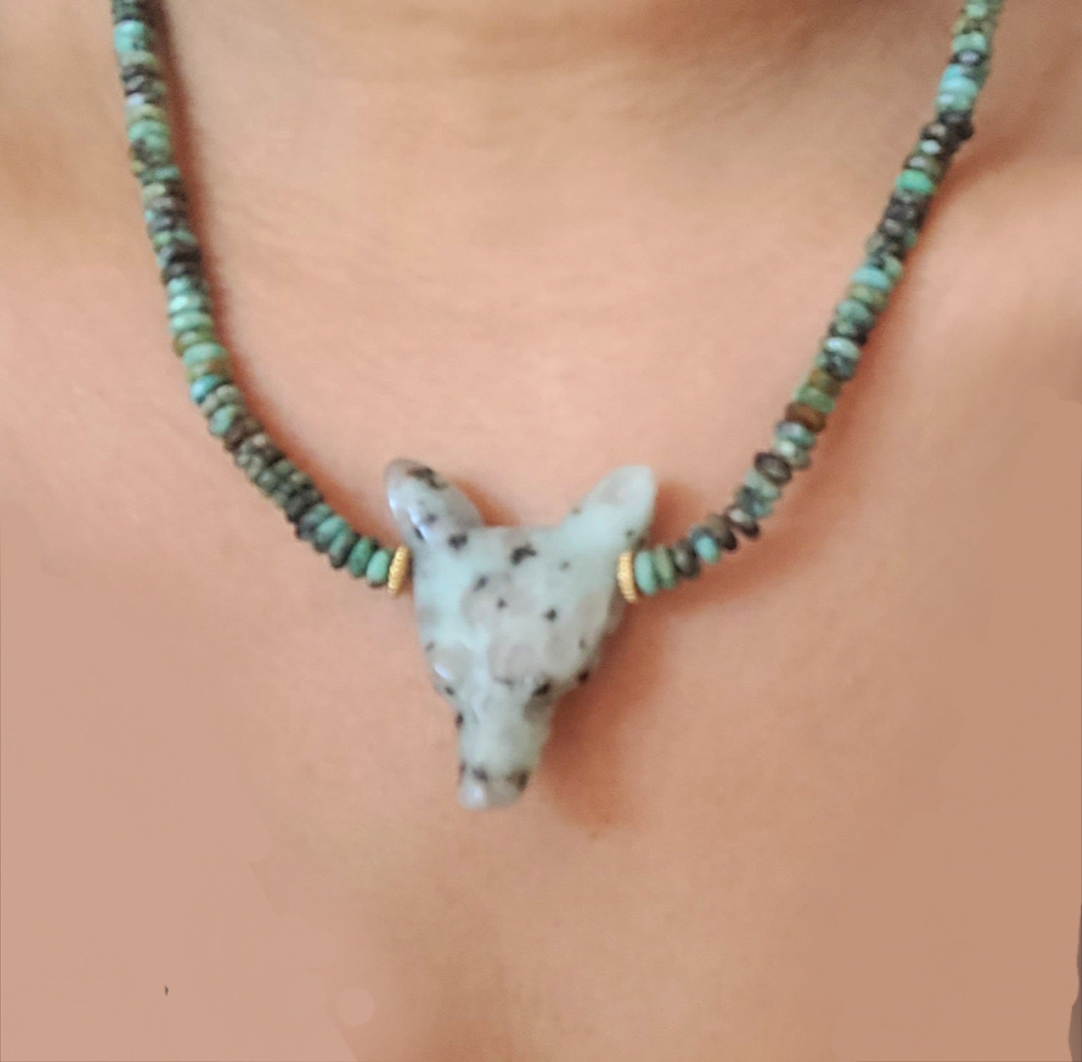 Collier en véritable turquoise africaine facetté à ma main avec une magnifique louve en pierre naturelle jaspe sésame ( dite aussi jaspe kiwi )