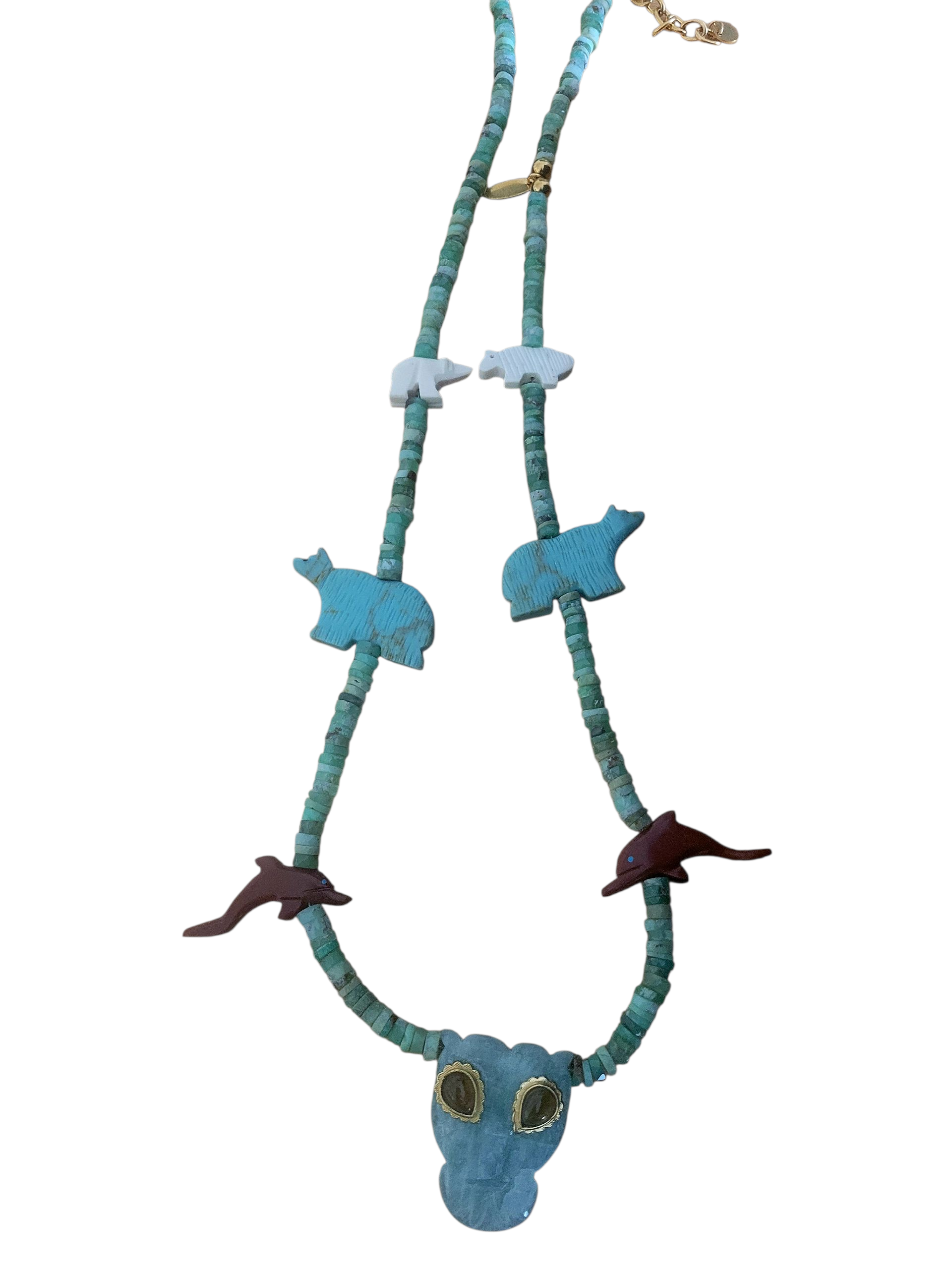Sautoir en véritable pierre naturelle amazonite avec totems amerindiens er iconique LIONNE en amazonite serti de cornaline.