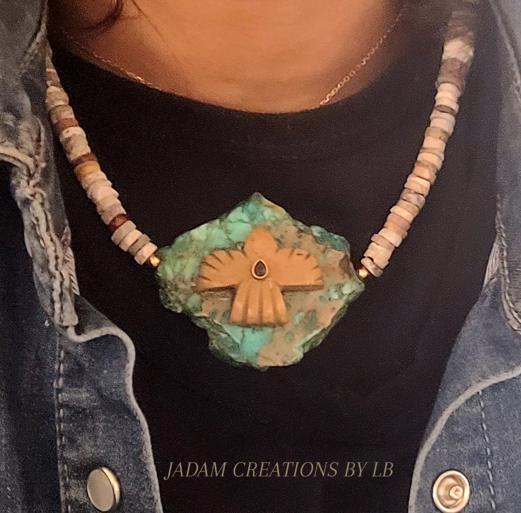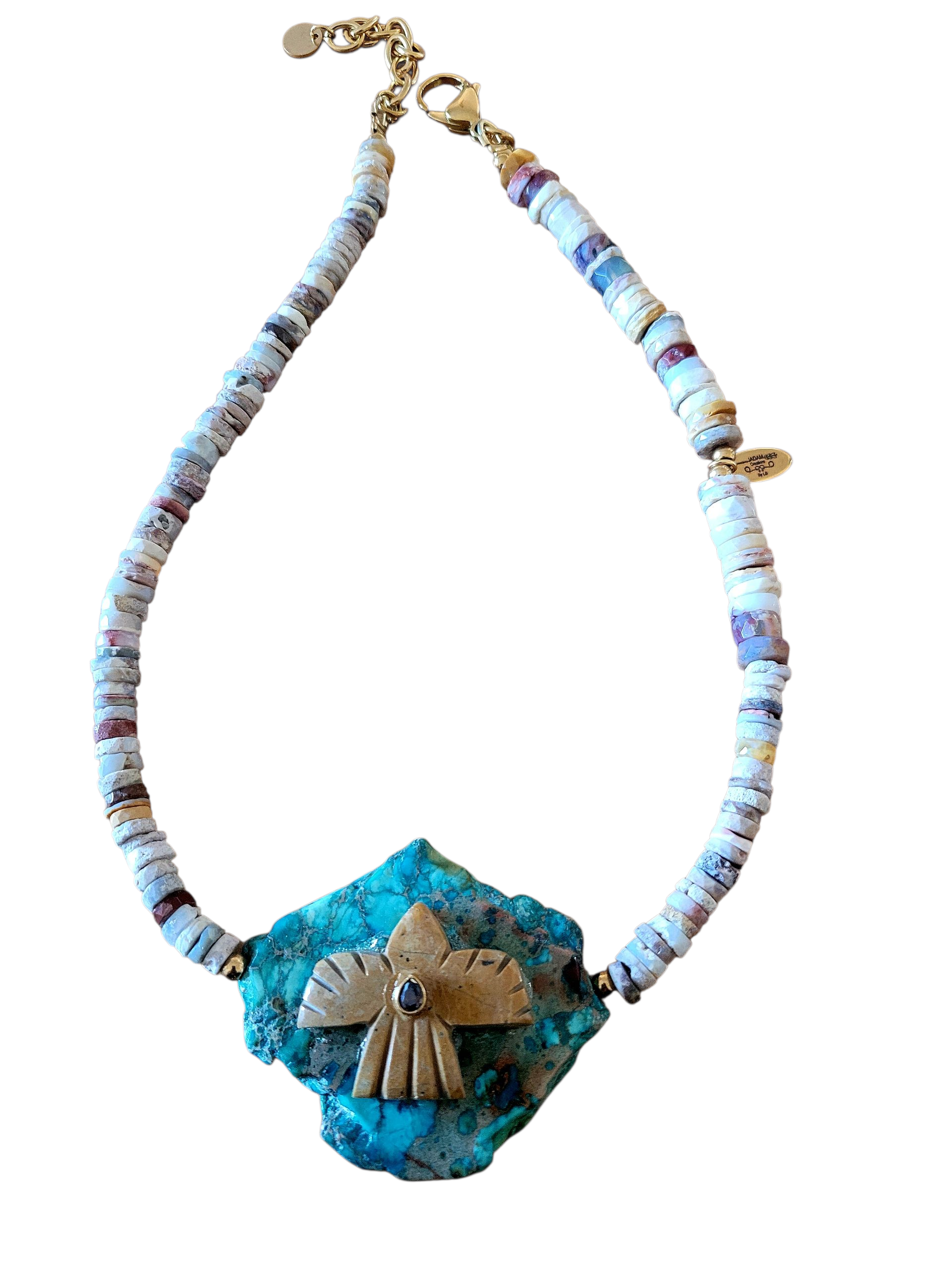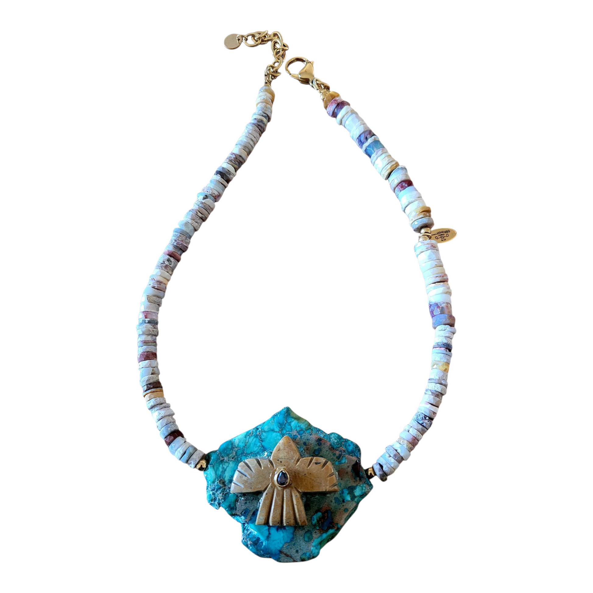 Collier artisanal en opale mexicaine et turquoise d’Arizona brute , sublimé d’un aigle sculpté en œil-de-tigre ornée d'un grenat centrale et plaquee or .