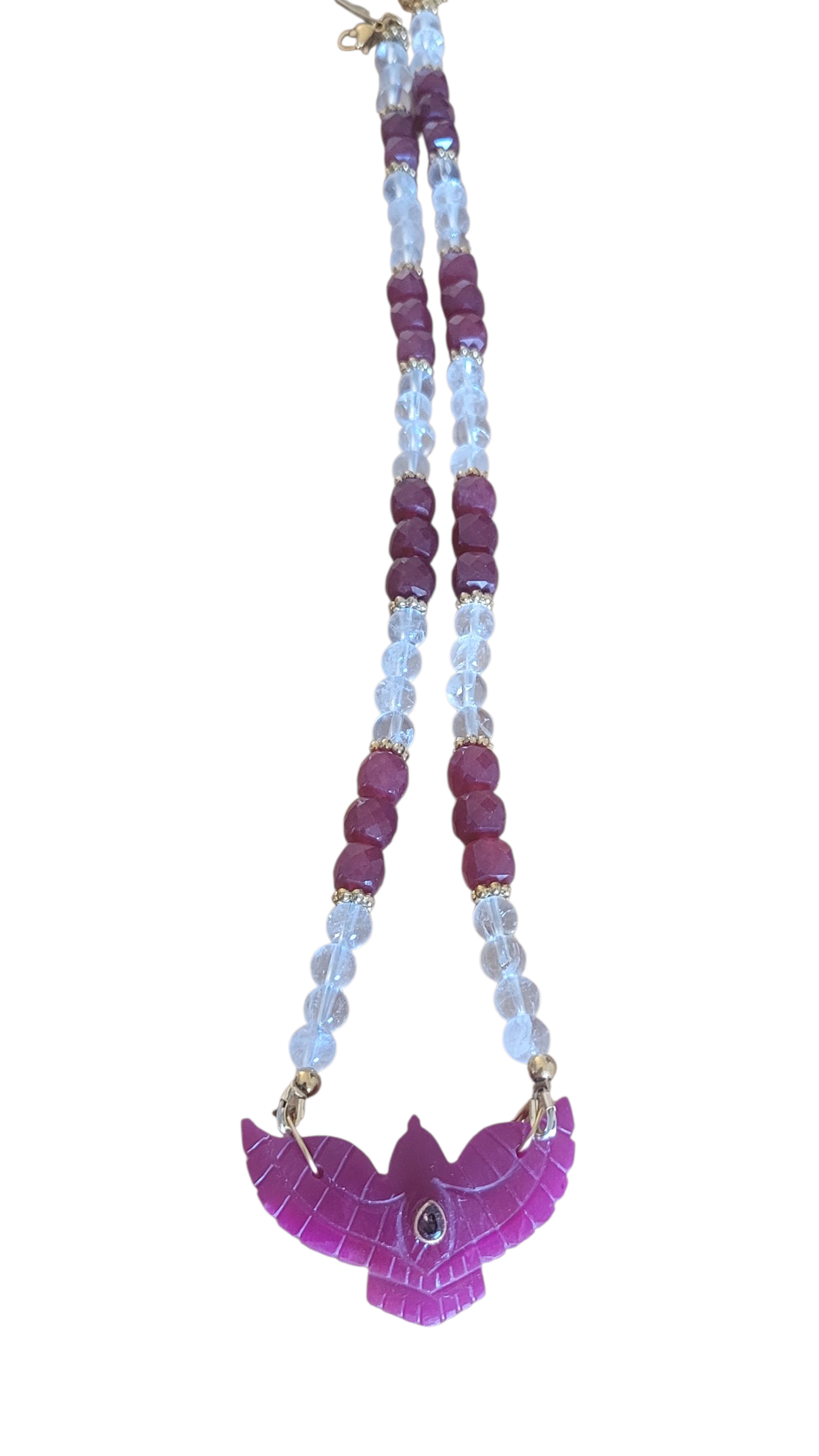 Entièrement façonnée à la main dans notre atelier en France sur la Côte d'Azur il est en pierre naturelle crustal de roche et calcedoine rose avec son totem en calcédoine rose subtilement coloré serti d'un véritable grenat.