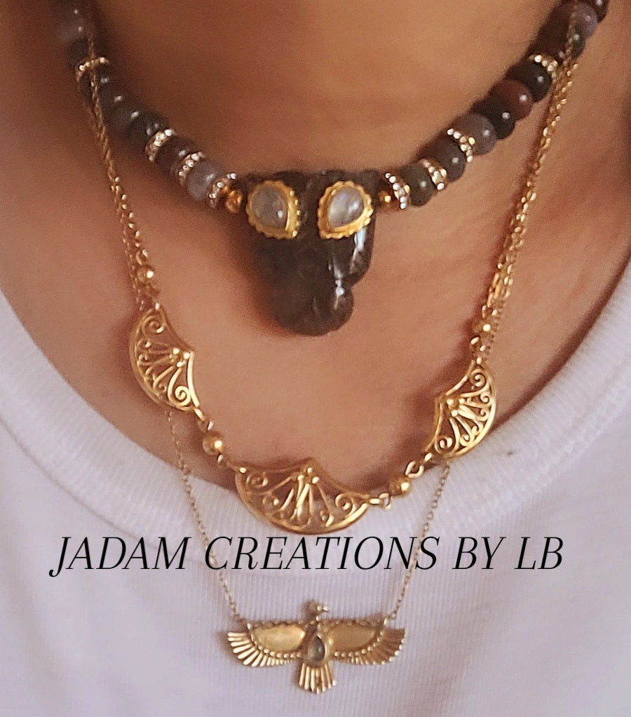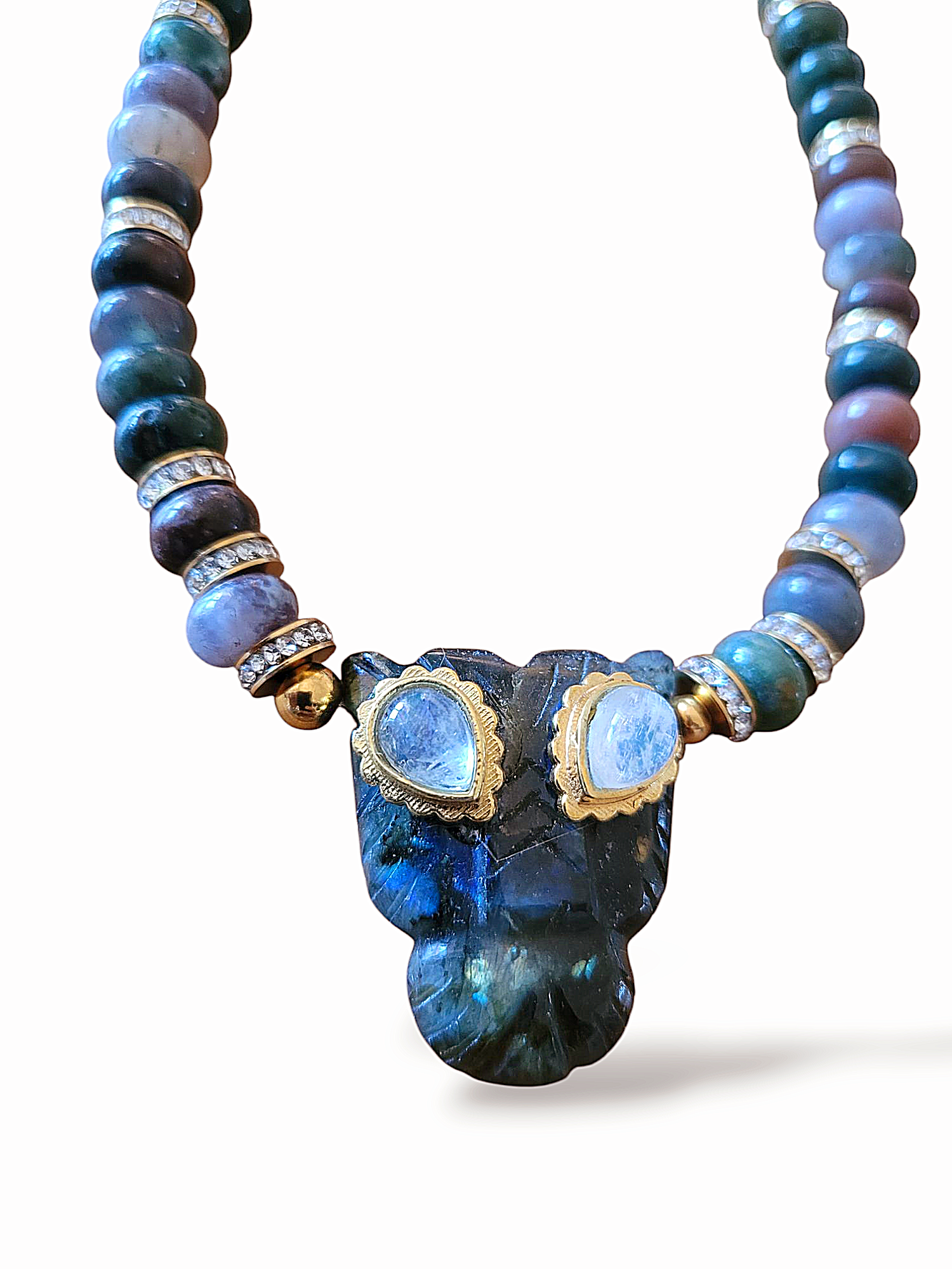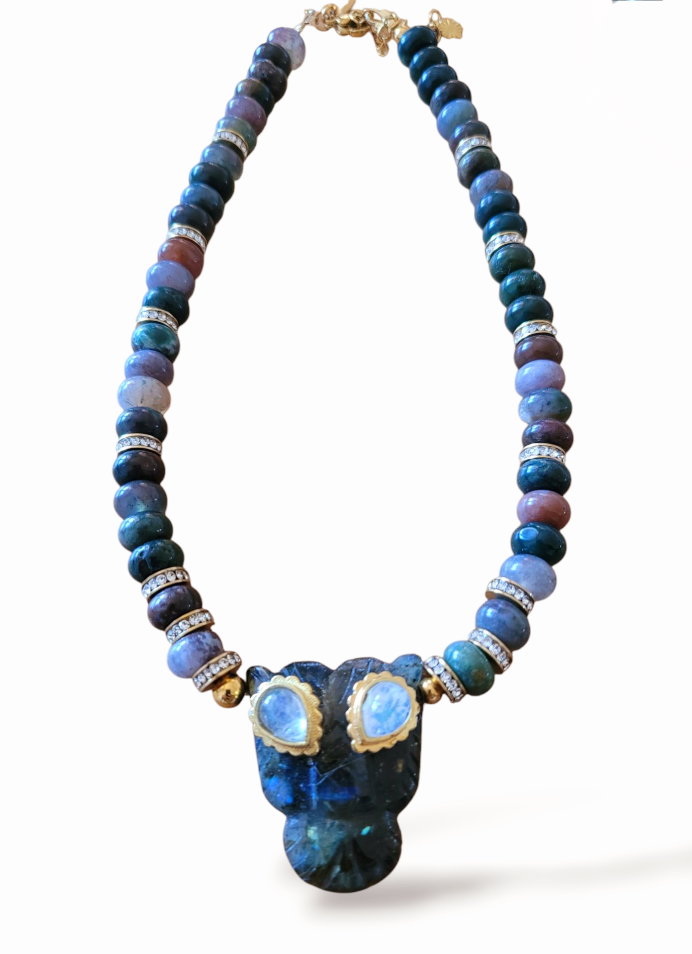 L'original est incontournable lionne tout en véritable agathe et tête en labradorite serti de véritable pierres de lune.