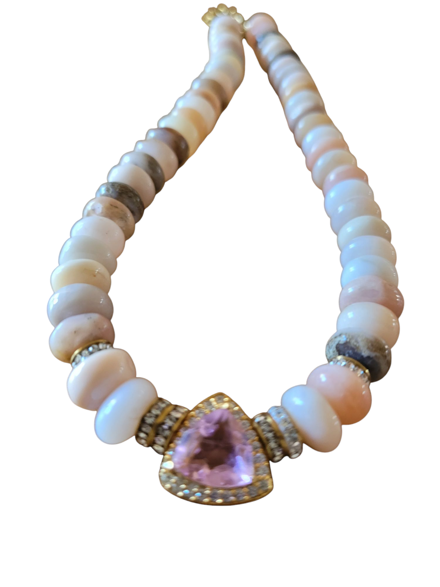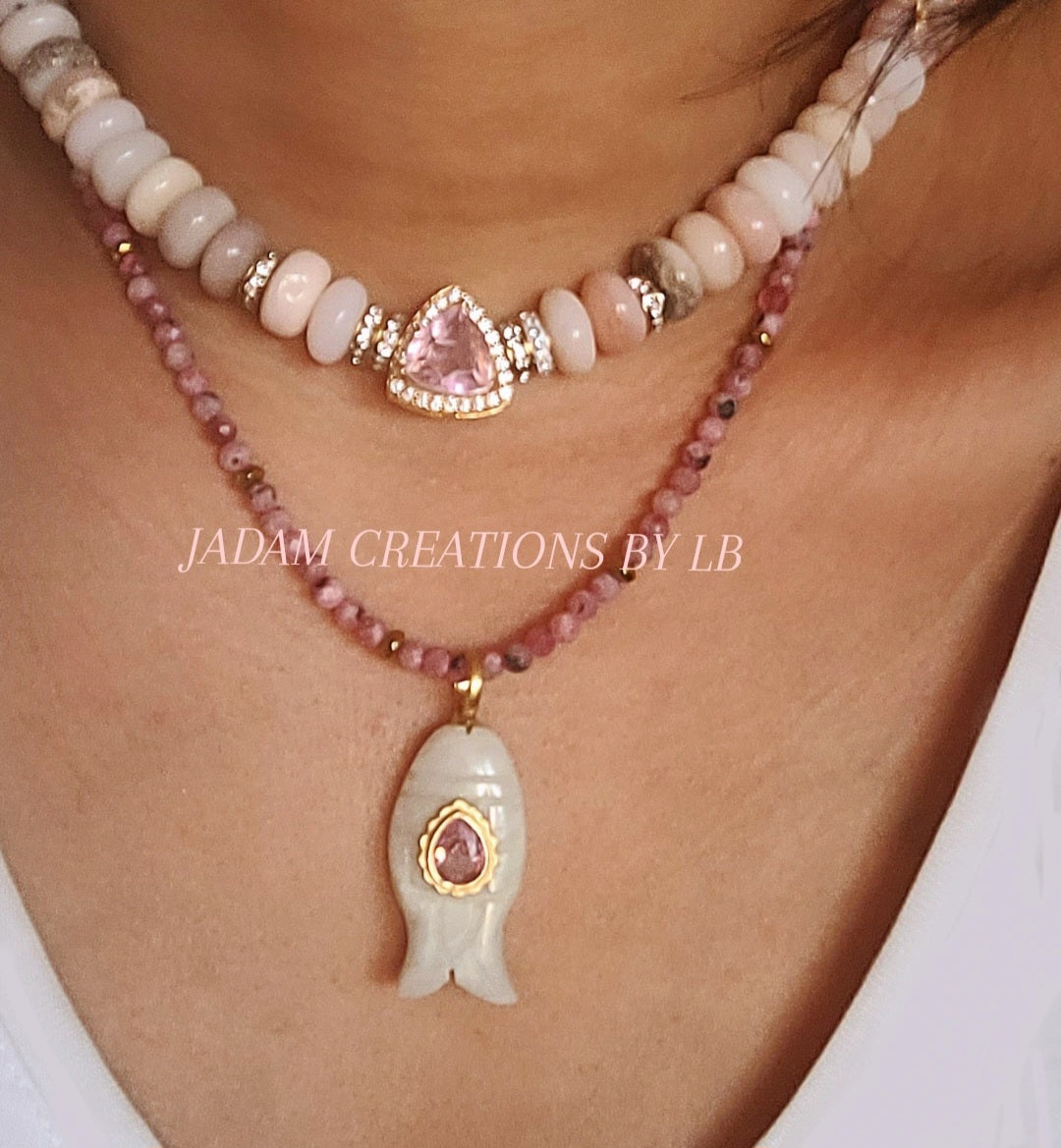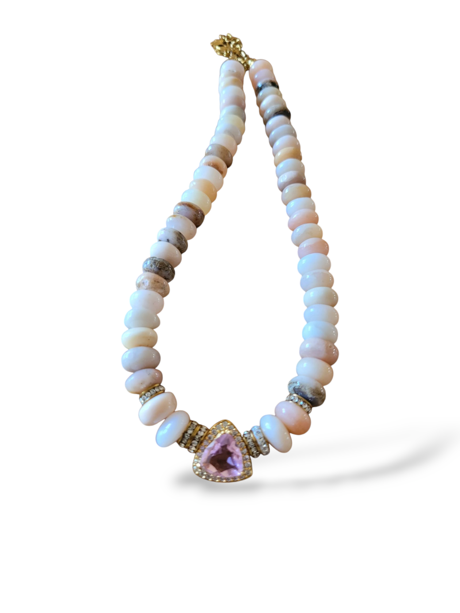 Collier boheme en véritable opal rose et sont central en plaquee or 18k et sont magnifique central en piètre semi précieuse topaz rose.
