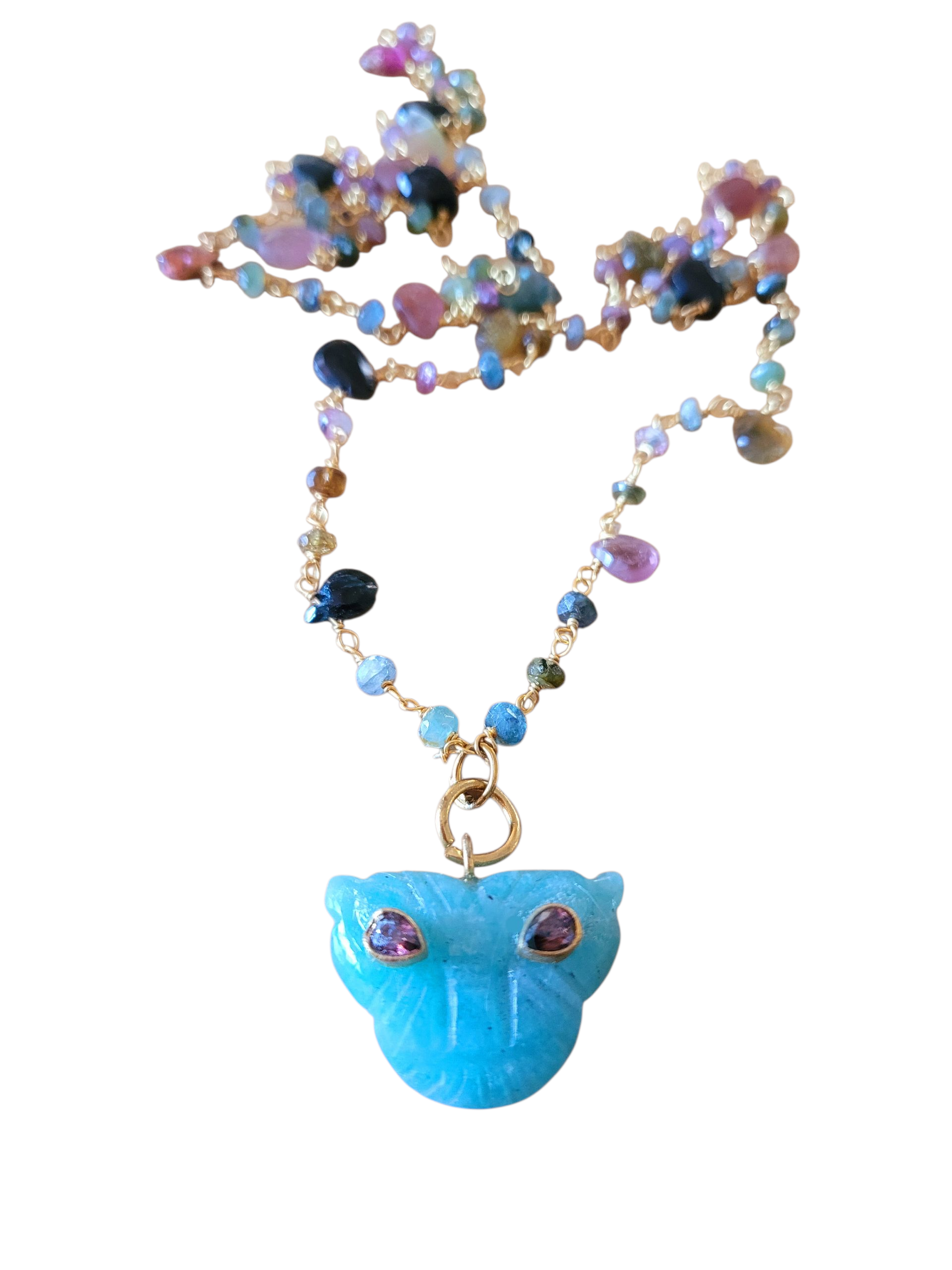 Minutieusement taillée à la main et sertis de grenats cette lionne en amazonite à un pouvoir qui amène l'expression directe et écarte toutes formes de pensées négatives.